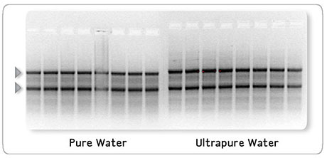 在實驗中,來自大腸桿菌的 rRNA將其加載到瓊脂糖凝膠上。用兩種類型的水制備凝膠和緩沖液:純凈水(類型2)和超純水(類型1)。結(jié)果如圖1所示。在超純水制備和運行的凝膠中,獲得了更高的信號/譜帶強度。