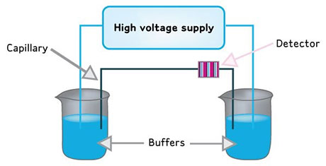 毛細(xì)管電泳是一種使用非常狹窄的毛細(xì)管的技術(shù),通常將內(nèi)徑為50 µm,外徑為300 µm,以分離各種各樣的大小分子。圖1是CE系統(tǒng)的示意圖。它包括電源,毛細(xì)管,緩沖液儲存器和檢測器。